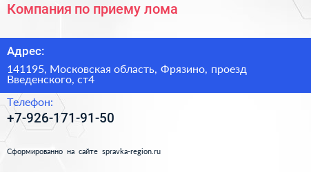 Компания по приему лома по адресу 141195, Московская область, Фрязино, проезд Введенского, ст4 в дальнейшем Организация, размещена в следующих категориях: