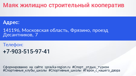 Маяк, жилищно-строительный кооператив по адресу 141196, Московская область, Фрязино, проезд Десантников, 7 в дальнейшем Организация, размещена в следующих категориях:
