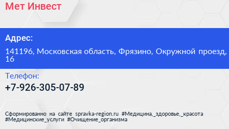 Мет-Инвест по адресу 141196, Московская область, Фрязино, Окружной проезд, 16 в дальнейшем Организация, размещена в следующих категориях: