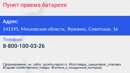 Пункт приема батареек по адресу 141195, Московская область, Фрязино, Советская, 1в в дальнейшем Организация, размещена в следующих категориях: