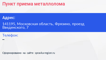 Пункт приема металлолома по адресу 141195, Московская область, Фрязино, проезд Введенского, 7 в дальнейшем Организация, размещена в следующих категориях: