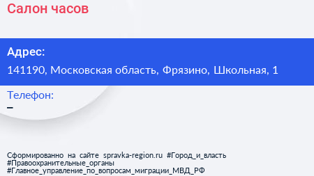 Салон часов по адресу 141190, Московская область, Фрязино, Школьная, 1 в дальнейшем Организация, размещена в следующих категориях: