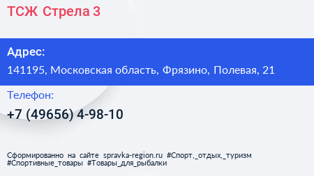 ТСЖ Стрела-3 по адресу 141195, Московская область, Фрязино, Полевая, 21 в дальнейшем Организация, размещена в следующих категориях: