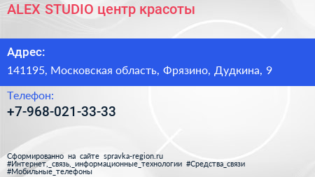 ALEX STUDIO, центр красоты по адресу 141195, Московская область, Фрязино, Дудкина, 9 в дальнейшем Организация, размещена в следующих категориях: