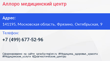 Аллоро, медицинский центр по адресу 141195, Московская область, Фрязино, Октябрьская, 9 в дальнейшем Организация, размещена в следующих категориях: