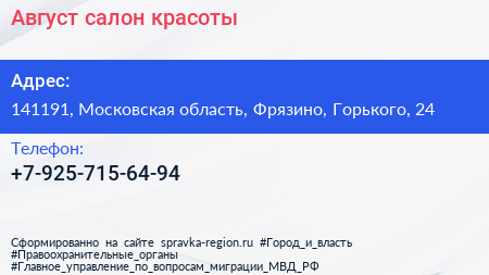 Август, салон красоты по адресу 141191, Московская область, Фрязино, Горького, 24 в дальнейшем Организация, размещена в следующих категориях: