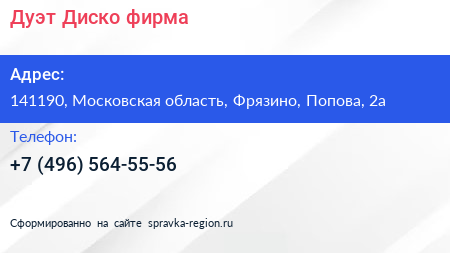 Дуэт-Диско, фирма по адресу 141190, Московская область, Фрязино, Попова, 2а в дальнейшем Организация, размещена в следующих категориях: