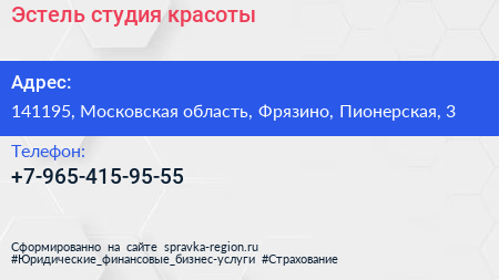 Эстель, студия красоты по адресу 141195, Московская область, Фрязино, Пионерская, 3 в дальнейшем Организация, размещена в следующих категориях: