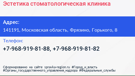 Эстетика, стоматологическая клиника по адресу 141191, Московская область, Фрязино, Горького, 8 в дальнейшем Организация, размещена в следующих категориях: