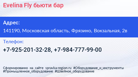 Evelina Fly, бьюти-бар по адресу 141190, Московская область, Фрязино, Вокзальная, 2в в дальнейшем Организация, размещена в следующих категориях: