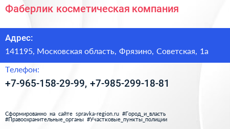 Фаберлик, косметическая компания по адресу 141195, Московская область, Фрязино, Советская, 1а в дальнейшем Организация, размещена в следующих категориях: