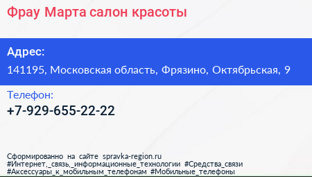 Фрау Марта, салон красоты по адресу 141195, Московская область, Фрязино, Октябрьская, 9 в дальнейшем Организация, размещена в следующих категориях: