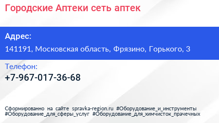 Городские Аптеки, сеть аптек по адресу 141191, Московская область, Фрязино, Горького, 3 в дальнейшем Организация, размещена в следующих категориях: