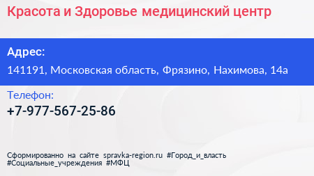 Красота и Здоровье, медицинский центр по адресу 141191, Московская область, Фрязино, Нахимова, 14а в дальнейшем Организация, размещена в следующих категориях: