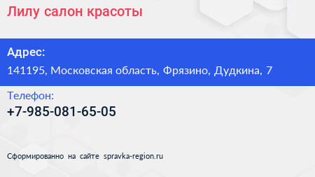 Лилу, салон красоты по адресу 141195, Московская область, Фрязино, Дудкина, 7 в дальнейшем Организация, размещена в следующих категориях: