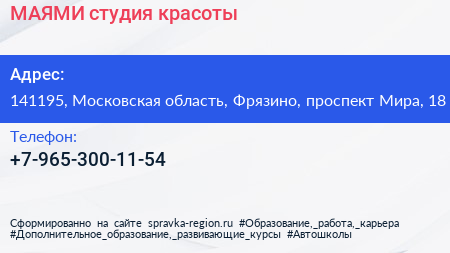 МАЯМИ, студия красоты по адресу 141195, Московская область, Фрязино, проспект Мира, 18 в дальнейшем Организация, размещена в следующих категориях: