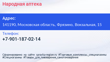 Народная аптека по адресу 141190, Московская область, Фрязино, Вокзальная, 15 в дальнейшем Организация, размещена в следующих категориях: