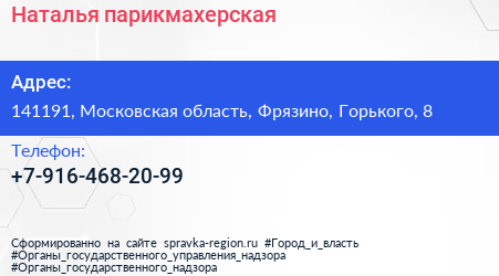 Наталья, парикмахерская по адресу 141191, Московская область, Фрязино, Горького, 8 в дальнейшем Организация, размещена в следующих категориях: