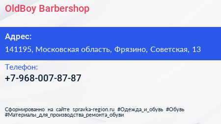 OldBoy Barbershop по адресу 141195, Московская область, Фрязино, Советская, 13 в дальнейшем Организация, размещена в следующих категориях: