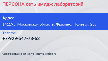 ПЕРСОНА, сеть имидж-лабораторий по адресу 141195, Московская область, Фрязино, Полевая, 23а в дальнейшем Организация, размещена в следующих категориях: