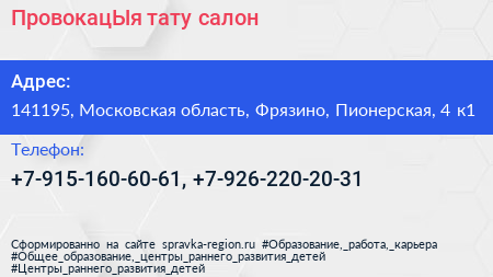 ПровокацЫя, тату-салон по адресу 141195, Московская область, Фрязино, Пионерская, 4 к1 в дальнейшем Организация, размещена в следующих категориях: