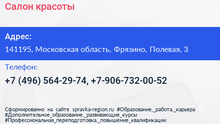 Салон красоты по адресу 141195, Московская область, Фрязино, Полевая, 3 в дальнейшем Организация, размещена в следующих категориях:
