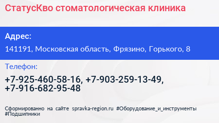 СтатусКво, стоматологическая клиника по адресу 141191, Московская область, Фрязино, Горького, 8 в дальнейшем Организация, размещена в следующих категориях: