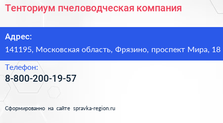 Тенториум, пчеловодческая компания по адресу 141195, Московская область, Фрязино, проспект Мира, 18 в дальнейшем Организация, размещена в следующих категориях: