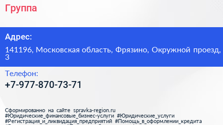Группа по адресу 141196, Московская область, Фрязино, Окружной проезд, 3 в дальнейшем Организация, размещена в следующих категориях: