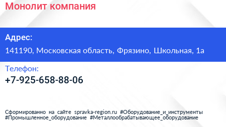 Монолит, компания по адресу 141190, Московская область, Фрязино, Школьная, 1а в дальнейшем Организация, размещена в следующих категориях:
