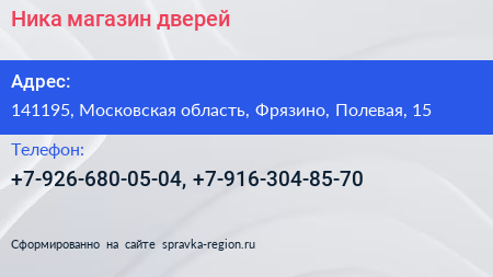 Ника, магазин дверей по адресу 141195, Московская область, Фрязино, Полевая, 15 в дальнейшем Организация, размещена в следующих категориях:
