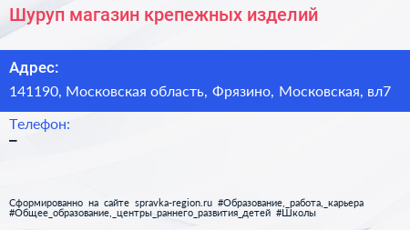 Шуруп, магазин крепежных изделий по адресу 141190, Московская область, Фрязино, Московская, вл7 в дальнейшем Организация, размещена в следующих категориях: