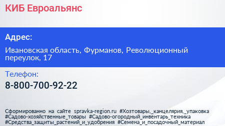 КИБ Евроальянс по адресу Ивановская область, Фурманов, Революционный переулок, 17 в дальнейшем Организация, размещена в следующих категориях: