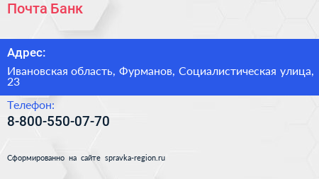 Почта Банк по адресу Ивановская область, Фурманов, Социалистическая улица, 23 в дальнейшем Организация, размещена в следующих категориях:
