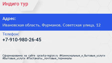 Индиго-тур по адресу Ивановская область, Фурманов, Советская улица, 12 в дальнейшем Организация, размещена в следующих категориях: