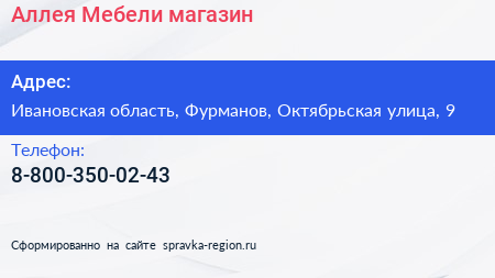 Аллея Мебели, магазин по адресу Ивановская область, Фурманов, Октябрьская улица, 9 в дальнейшем Организация, размещена в следующих категориях: