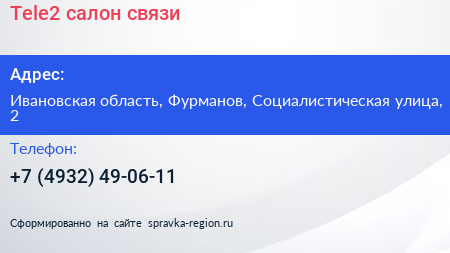 Tele2, салон связи по адресу Ивановская область, Фурманов, Социалистическая улица, 2 в дальнейшем Организация, размещена в следующих категориях: