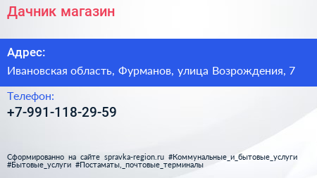 Дачник, магазин по адресу Ивановская область, Фурманов, улица Возрождения, 7 в дальнейшем Организация, размещена в следующих категориях: