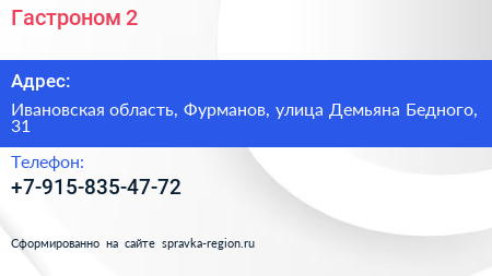 Гастроном №2 по адресу Ивановская область, Фурманов, улица Демьяна Бедного, 31 в дальнейшем Организация, размещена в следующих категориях: