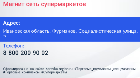 Магнит, сеть супермаркетов по адресу Ивановская область, Фурманов, Социалистическая улица, 5 в дальнейшем Организация, размещена в следующих категориях: