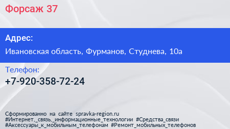 Форсаж 37 по адресу Ивановская область, Фурманов, Студнева, 10а в дальнейшем Организация, размещена в следующих категориях: