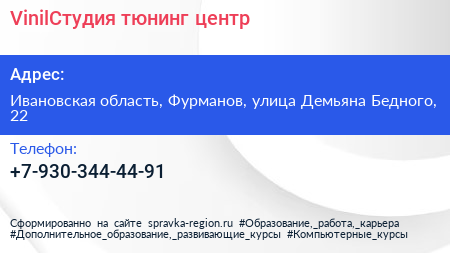 VinilСтудия, тюнинг-центр по адресу Ивановская область, Фурманов, улица Демьяна Бедного, 22 в дальнейшем Организация, размещена в следующих категориях: