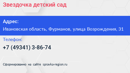 Звездочка, детский сад по адресу Ивановская область, Фурманов, улица Возрождения, 31 в дальнейшем Организация, размещена в следующих категориях: