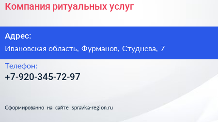 Компания ритуальных услуг по адресу Ивановская область, Фурманов, Студнева, 7 в дальнейшем Организация, размещена в следующих категориях: