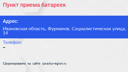 Пункт приема батареек по адресу Ивановская область, Фурманов, Социалистическая улица, 14 в дальнейшем Организация, размещена в следующих категориях: