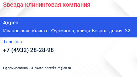 Звезда, клининговая компания по адресу Ивановская область, Фурманов, улица Возрождения, 32 в дальнейшем Организация, размещена в следующих категориях:
