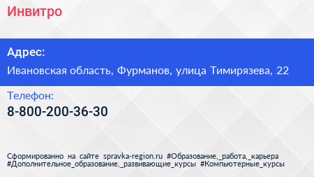Инвитро по адресу Ивановская область, Фурманов, улица Тимирязева, 22 в дальнейшем Организация, размещена в следующих категориях: