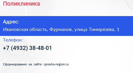 Поликлиника по адресу Ивановская область, Фурманов, улица Тимирязева, 1 в дальнейшем Организация, размещена в следующих категориях: