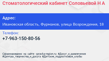 Стоматологический кабинет Соловьевой Н.А. по адресу Ивановская область, Фурманов, улица Возрождения, 18 в дальнейшем Организация, размещена в следующих категориях: