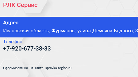 РЛК-Сервис по адресу Ивановская область, Фурманов, улица Демьяна Бедного, 3 в дальнейшем Организация, размещена в следующих категориях: